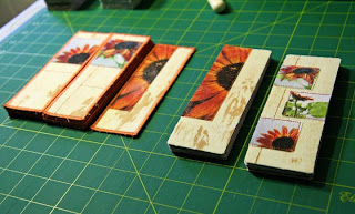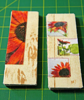 Next, I laid out all the cut bookmarks and placed the fabric photos on them until I was satisfied with the placement of each. On these sunflower bookmarks, it took a bit of rearranging until I was happy with them as the pattern of the fabric became part of the overall design.