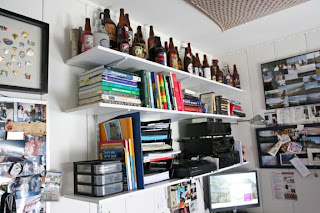 thanks for sharing your work space … i too share with my husband & really you should see the mess we have. My work station seems to end up being the general dumping ground in out house. oh & the beer bottle … i feel ya!!