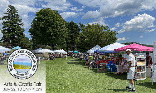 The Schroon Lake Association will be holding its 53rd Arts and Crafts Fair on Saturday, July 22, 2023, in the Town Park overlooking Schroon Lake. All the profits that the SLA derives from the Fair go toward the continuing efforts to protect and maintain the health and welfare of the lake (e.g., hiring a certified lake manager as a consultant, funding scientific studies of the lake water, underwriting the fees involved in CSLAP and ensuring that there are sufficient funds for milfoil harvesting)