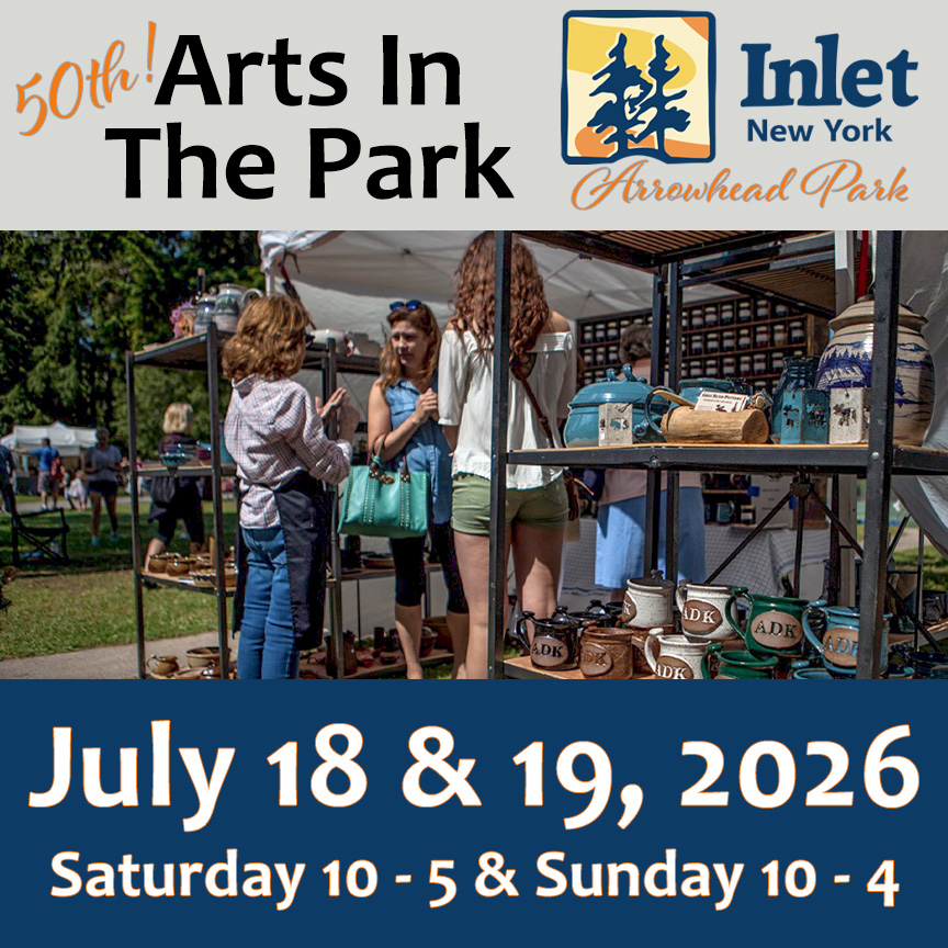 Join us for Inlet’s 50th annual Arts in the Park! Arrowhead Park will be filled with dozens of artisan and food booths, alongside live music and artist demos. Join us for a wonderful festival weekend in a beautiful little Upstate NY town! Arrowhead park is located on the shore of Fourth Lake, at 160 State Route 28, Inlet NY.