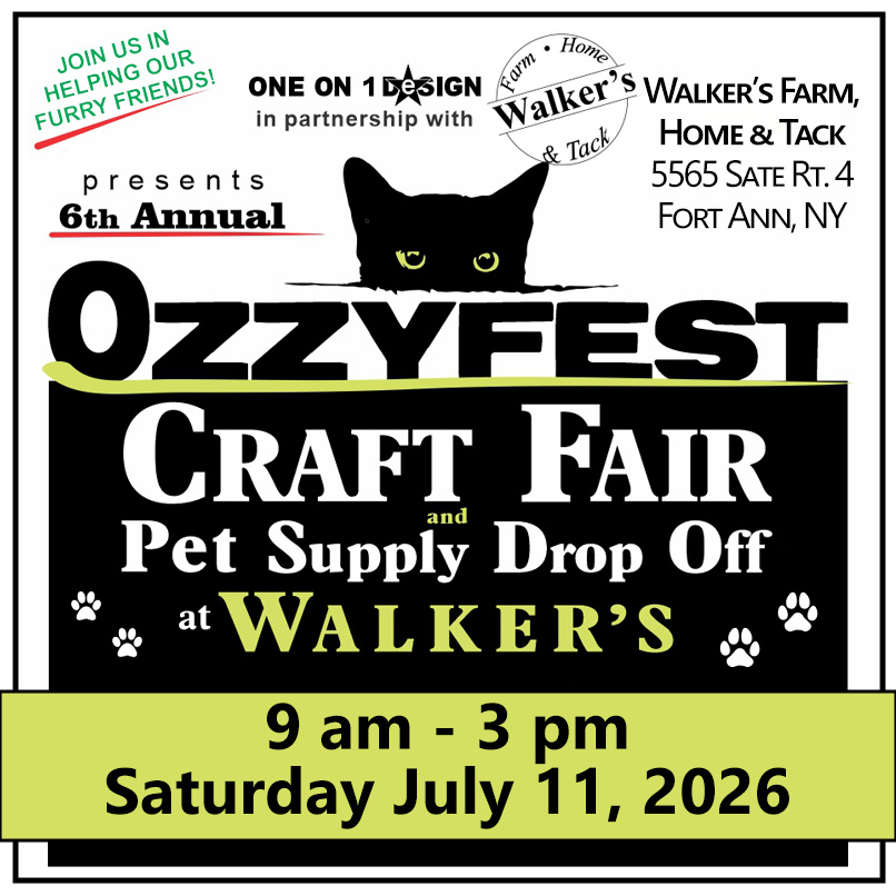 What is Ozzyfest? ‘0zzyfest’, named after event organizers’ (Rick & Lois from One on 1 Design) adopted cat 0zzy, is a pet supply donation drop off & artisan fair all rolled up into one cool event! There will be free t-shirts for anyone bringing a donation, tons of wonderful artisan vendors, food, puppies & kittens, and music. All at Walker’s Farm, Home, & Tack, 5565 State Route 4, Fort Ann, NY.